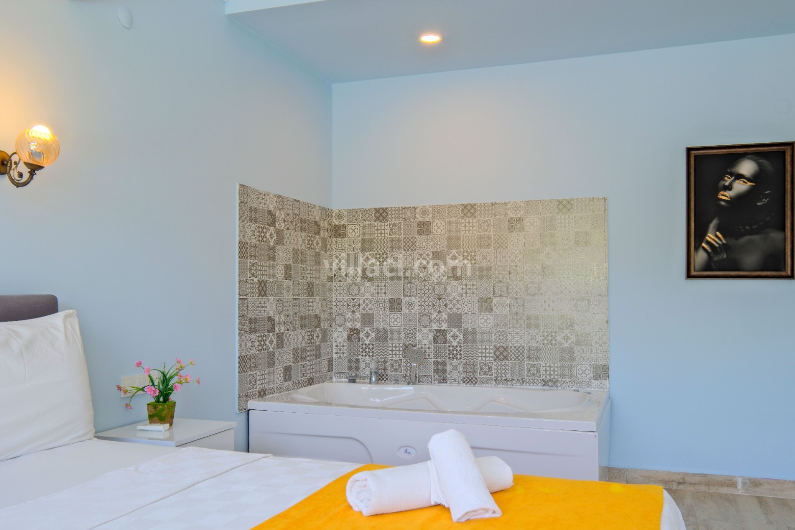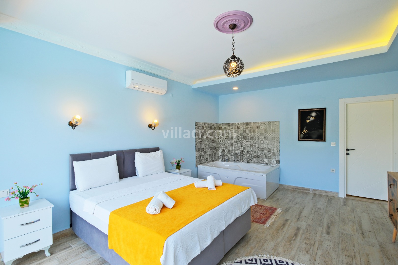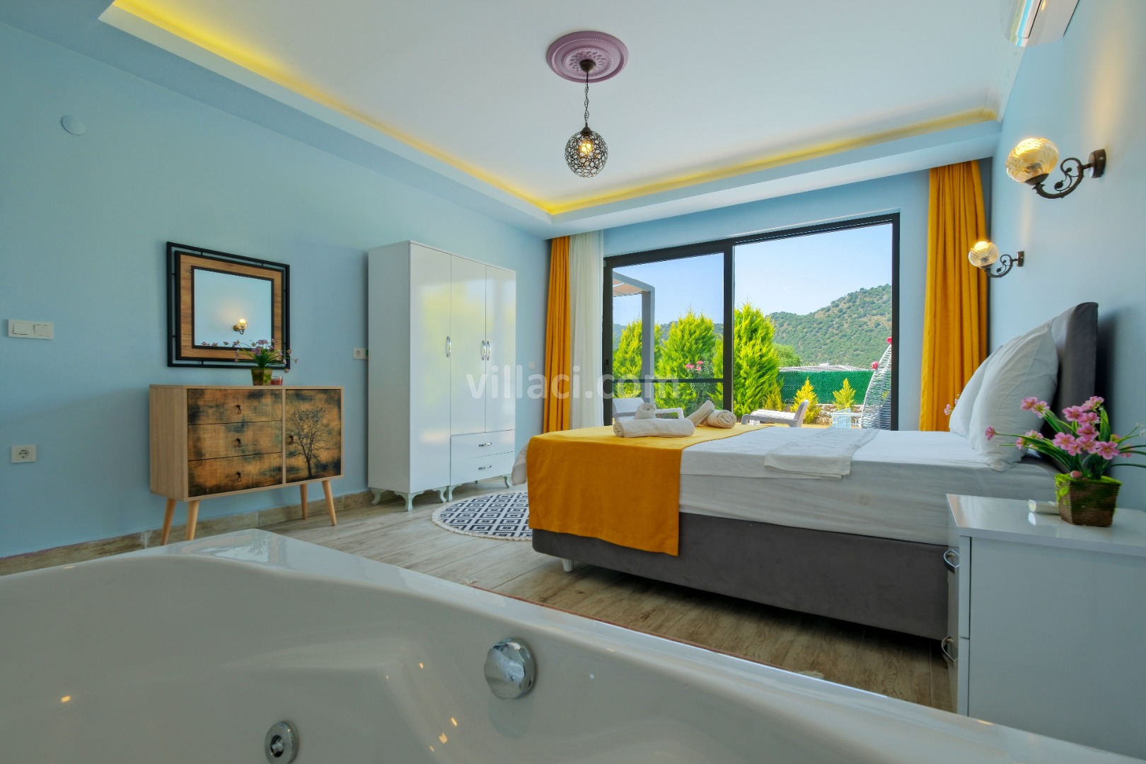 1. Yatak Odası1 Çift Kişilik Yatak, 1 Jakuzi, 1 Banyo/WC, 2 Komodin, Elbise dolabı, Makyaj Masası, Klima