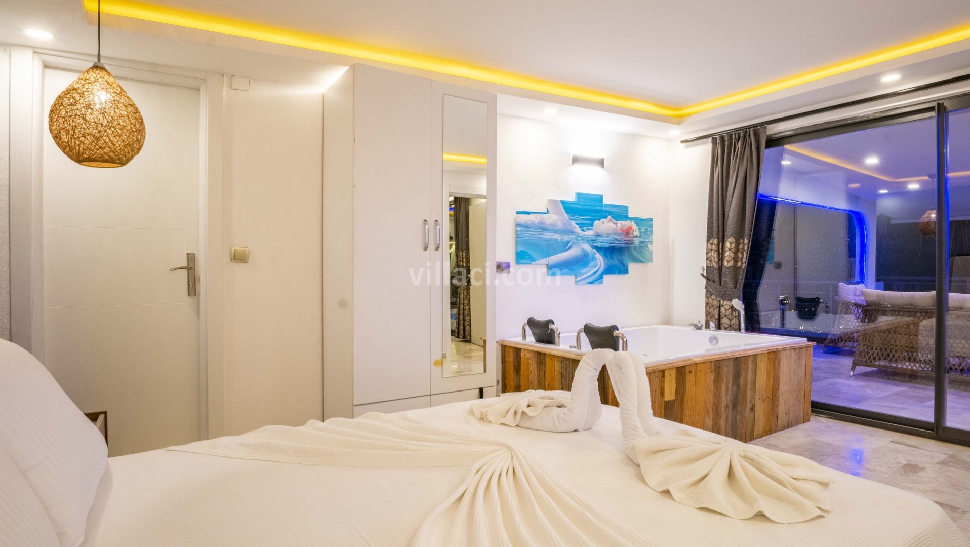 1. Yatak Odası1 Çift Kişilik Yatak, 1 Jakuzi, 1 Banyo/WC, 2 Komodin, Elbise dolabı, Makyaj Masası, Klima