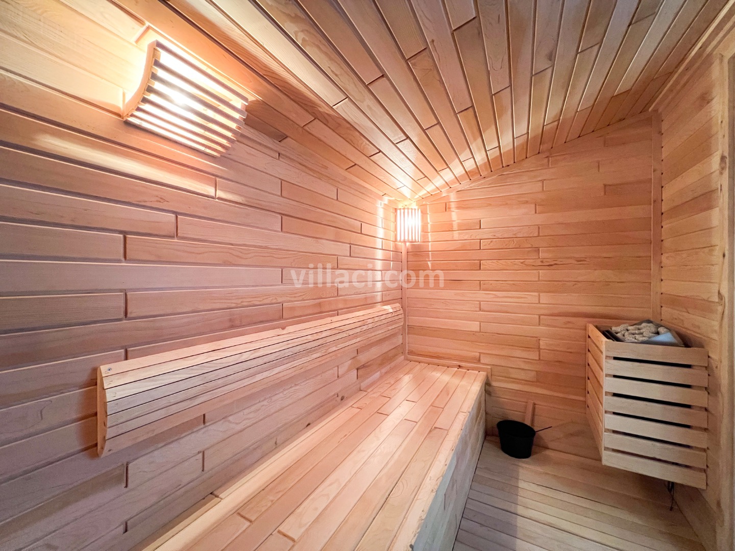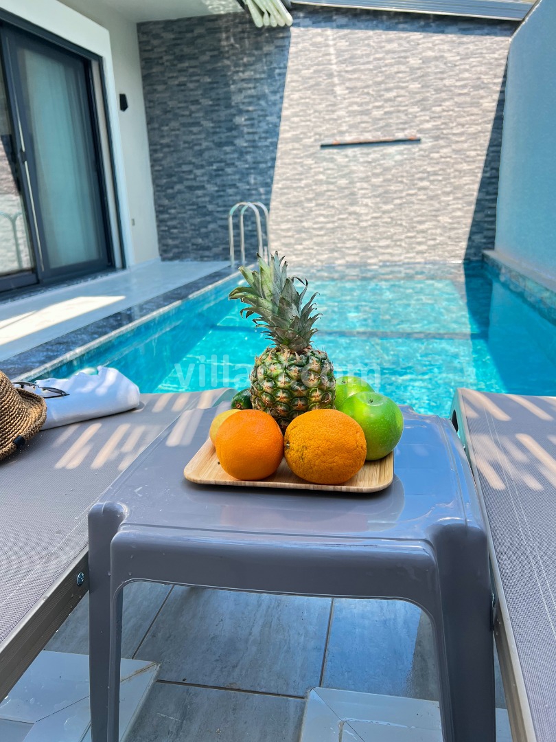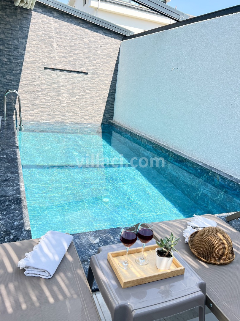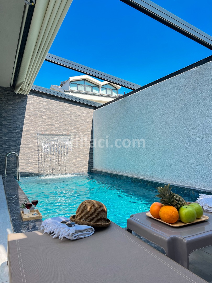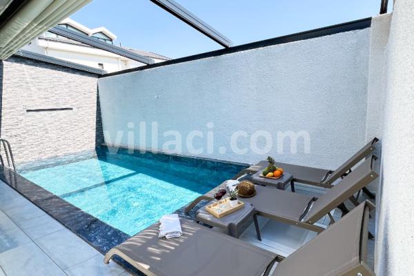 Villamızın havuzu ısıtmalı olup, üzeri açılır-kapanır pergole sistemi ile kapanır hale getirilmiştir. Bu sayede havuz alanı korunaklı hale gelmektedir.