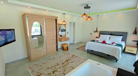 1 Çift Kişilik Yatak, 1 Jakuzi, 1 Banyo/WC, TV, 2 Komodin, Elbise dolabı, Makyaj Masası, Klima