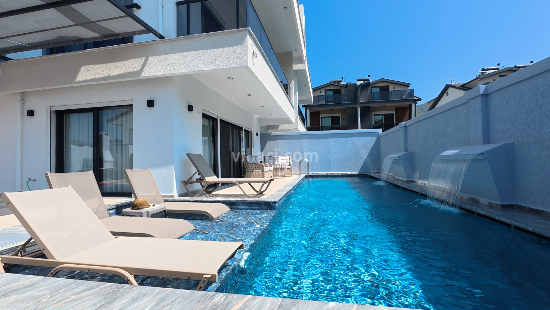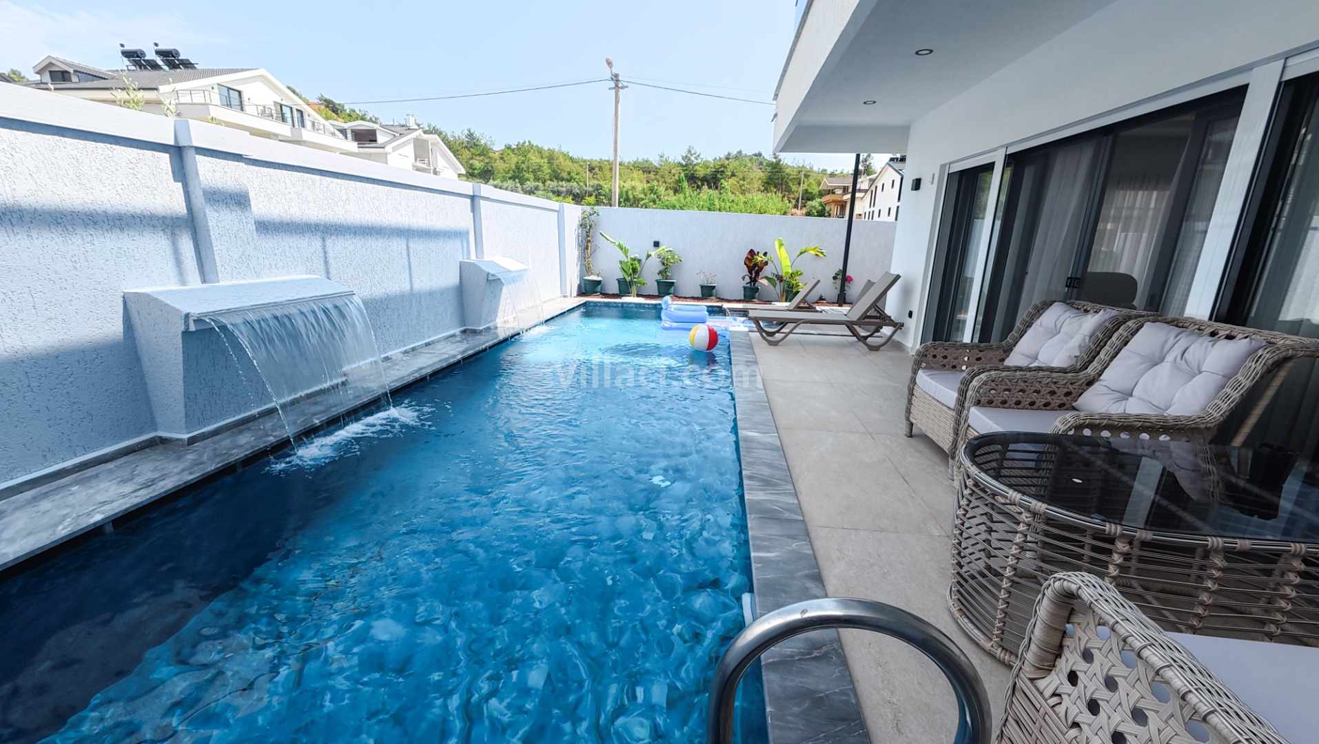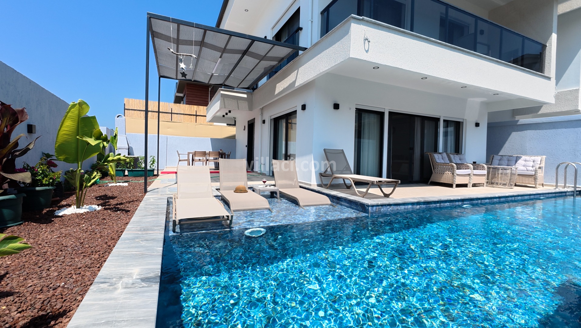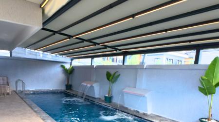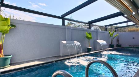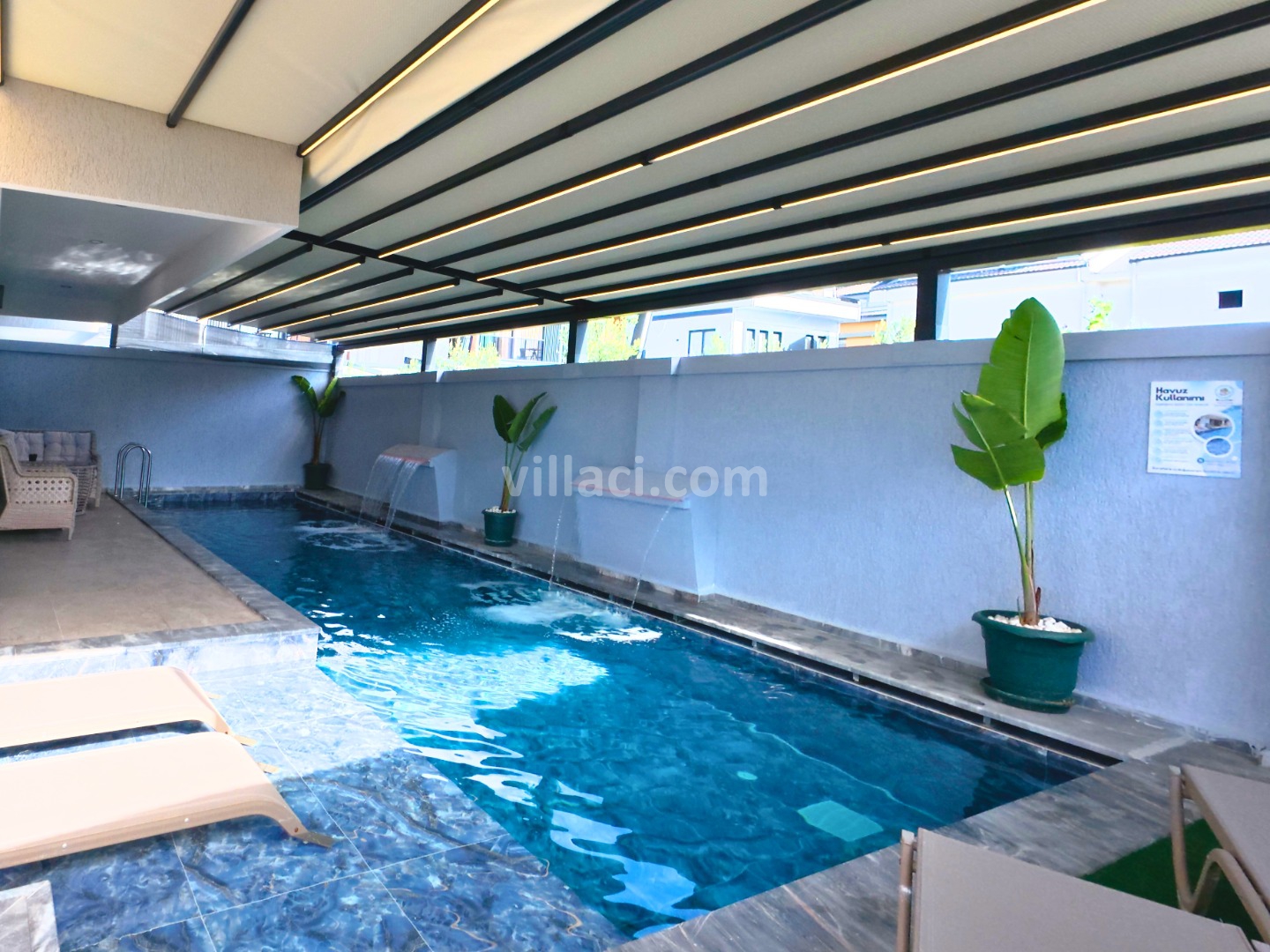 Villamızın havuzu ısıtmalı olup, üzeri açılır-kapanır pergole sistemi ile kapanır hale getirilmiştir. Bu sayede havuz alanı korunaklı hale gelmektedir.